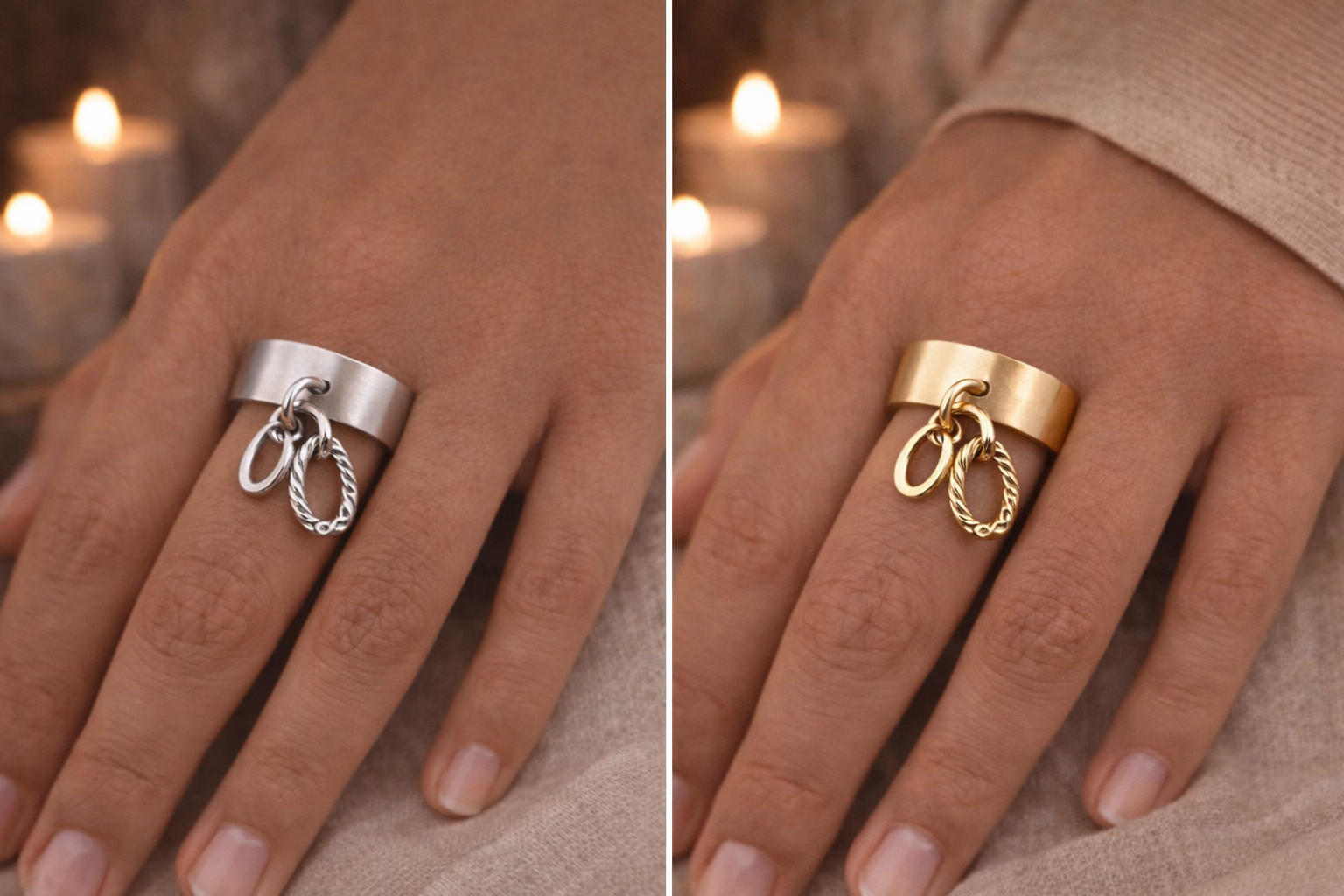 Bague en acier inoxydable ajustable, au design unique composé d’anneaux ovales martelés. Le travail de texture reflète la lumière et crée un effet brut et élégant à la fois. Confortable et résistante, elle s’adapte à toutes les tailles de doigt et offre un style moderne et intemporel, parfait à porter au quotidien ou en touche sophistiquée.